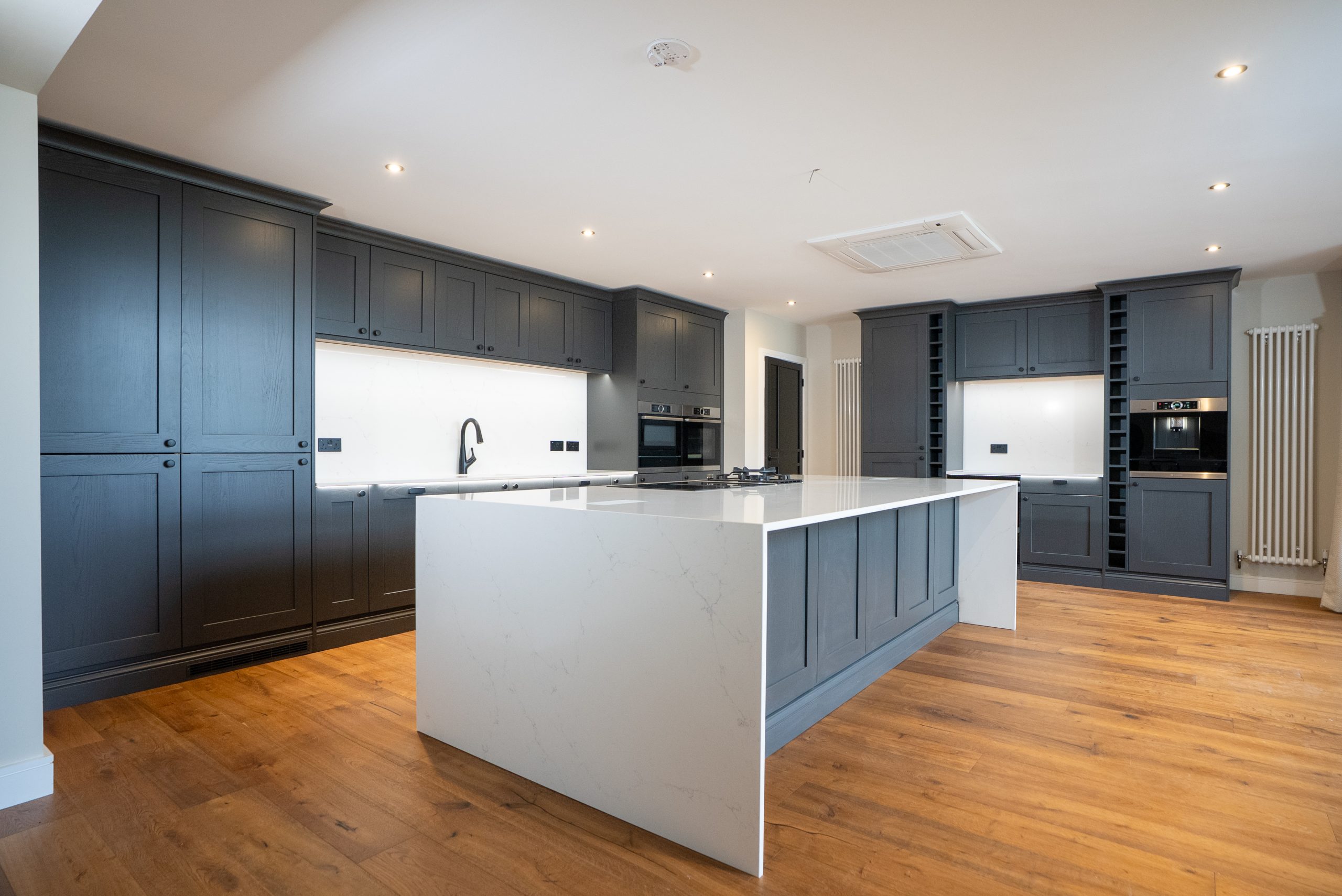 A Solid Ash Shaker door painted in Graphite paired with matte black handles established a bold, timeless aesthetic. The crisp white quartz worktop and matching splashback offered a clean contrast, achieving a modern-industrial feel while retaining warmth and texture through the natural woodgrain finish.